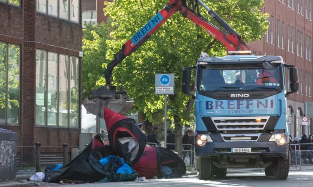 فككت شرطة دبلن خيام المهاجرين وطالبي اللجوء في أيرلندا صباح اليوم، وأزالت حوالي 200 خيمة، بعد أن تفاقمت أزمة الهجرة واللجوء مع بريطانيا. حيث توجهت قوافل من مركبات الشرطة وشاحنات المجلس ورافعات لإزالة الخيام في مدينة دبلن، وأزالوا تدريجيًا جميع آثار المخيم. وفقًا لصحفية الجارديان "The Guardian".