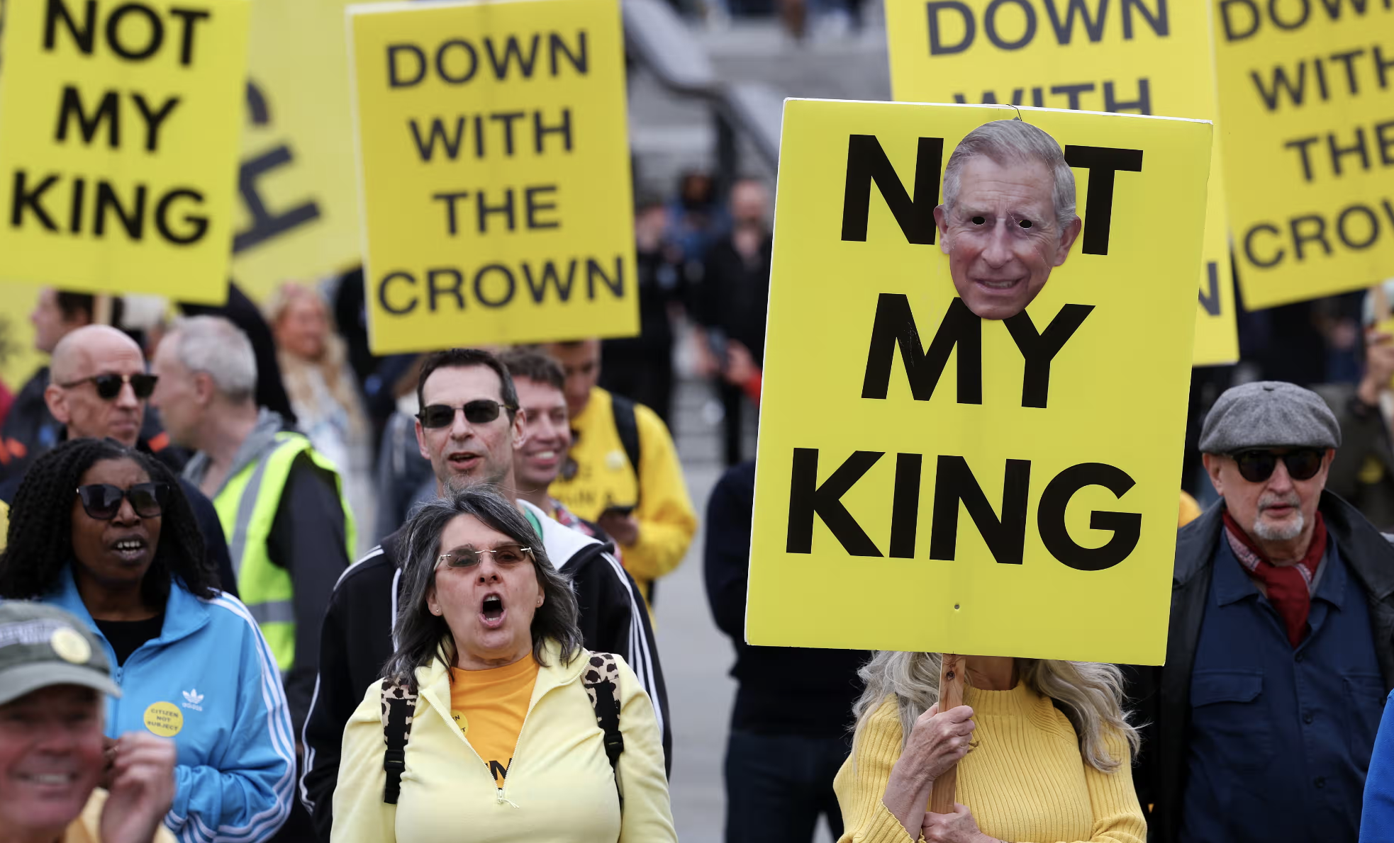 نظمت مجموعة معادية للنظام الملكي مظاهرة في وسط لندن، حيث شارك نحو 100 شخص في مسيرة جمهورية تطالب بإلغاء النظام الملكي، استعداداً للذكرى السنوية الأولى لتتويج الملك تشارلز. وجاءت التظاهرة بمشاركة موازية في مدن أخرى مثل إدنبره وكارديف.