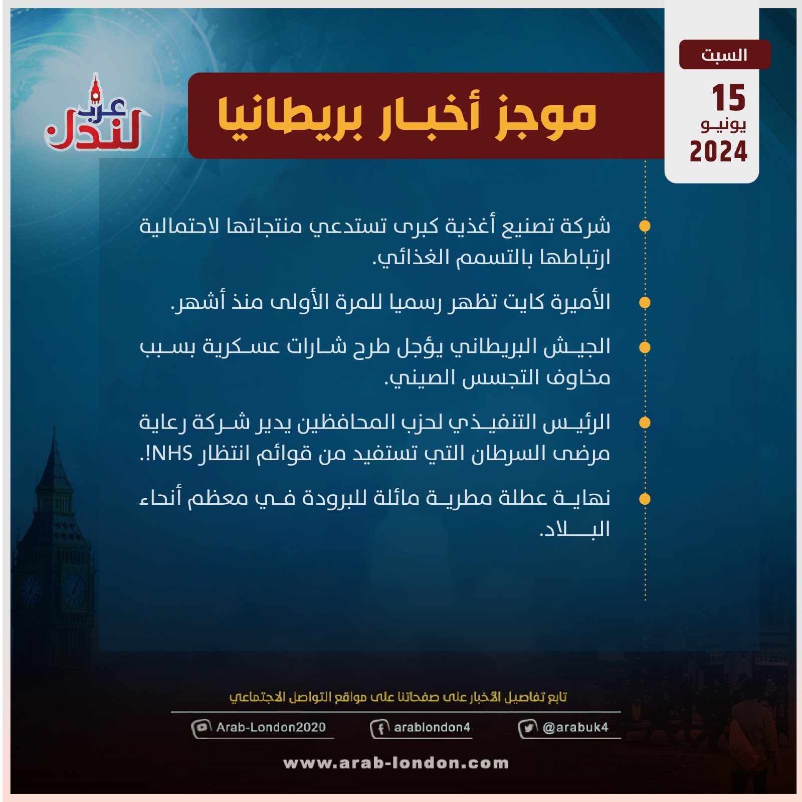 الرئيسية أخبار موجز أخبار بريطانيا من منصة عرب لندن: السبت 15 يونيو / حزيران 2024 أخبار موجز أخبار بريطانيا من منصة عرب لندن: السبت 15 يونيو / حزيران 2024 2024-06-15 موجز أخبار بريطانيا من منصة عرب لندن: السبت 15 يونيو / حزيران 2024 🔴شركة تصنيع أغذية كبرى تستدعي منتجاتها لاحتمالية ارتباطها بالتسمم الغذائي🔴 الأميرة كايت تظهر رسميا للمرة الأولى منذ أشهر🔴الجيش البريطاني يؤجل طرح شارات عسكرية بسبب مخاوف التجسس الصيني🔴 الرئيس التنفيذي لحزب المحافظين يدير شركة رعاية مرضى السرطان التي تستفيد من قوائم انتظار NHS!🔴 نهاية عطلة مطرية مائلة للبرودة في معظم أنحاء البلاد السابق للمرة الأولى منذ بدء علاجها من السرطان.. الأميرة كايت تطل رسميا التالي الجيش البريطاني يؤجل طرح شارات عسكرية بسبب مخاوف التجسس الصيني تابعوا آخر أخبار عرب لندن عبر Google News الاكثر قراءة الديلي ميل: دبي انتهت والناس يفرون منها !! 2026-03-12 لندن تدرس فرض رسوم إضافية على سيارات الدفع الرباعي للحد من حوادث الطرق 2026-03-13 هل تحولت السياسة الأمريكية إلى حرب صليبية على إيران بقيادة وزير الدفاع الأمريكي؟ 2026-03-12 أمسية حوارية على منصة عرب لندن بعنوان “زلزال قوانين الهجرة البريطانية” 2026-03-14 وفاتان في بريطانيا بمرض التهاب السحايا: ما هو وما أعراضه وكيف تحمي نفسك؟ 2026-03-17 مهندس بريطاني يحوّل طائرة "بوينغ 737" إلى ملجأ نووي في حديقة منزله 2026-03-12 مقالات ذات صلة موجز أخبار بريطانيا من منصة عرب لندن: الأربعاء: 17 مارس/آذار 2026 2026-03-18 كاميرات "بدون فلاش": تكنولوجيا رادارية متطورة لرصد السرعة في لندن 2026-03-18 عاجل| بسبب تبييض جرائم الحرب في السودان.. شبكة "سكاي نيوز" تنهي شراكتها مع الإمارات 2026-03-18 إنجلترا تستعد لتطبيق نظام "إعادة التدوير المبسّط": قواعد صارمة وغرامات مالية وشيكة 2026-03-18 الملك تشارلز يستقبل الرئيس النيجيري في أول زيارة دولة منذ 37 عاماً 2026-03-18