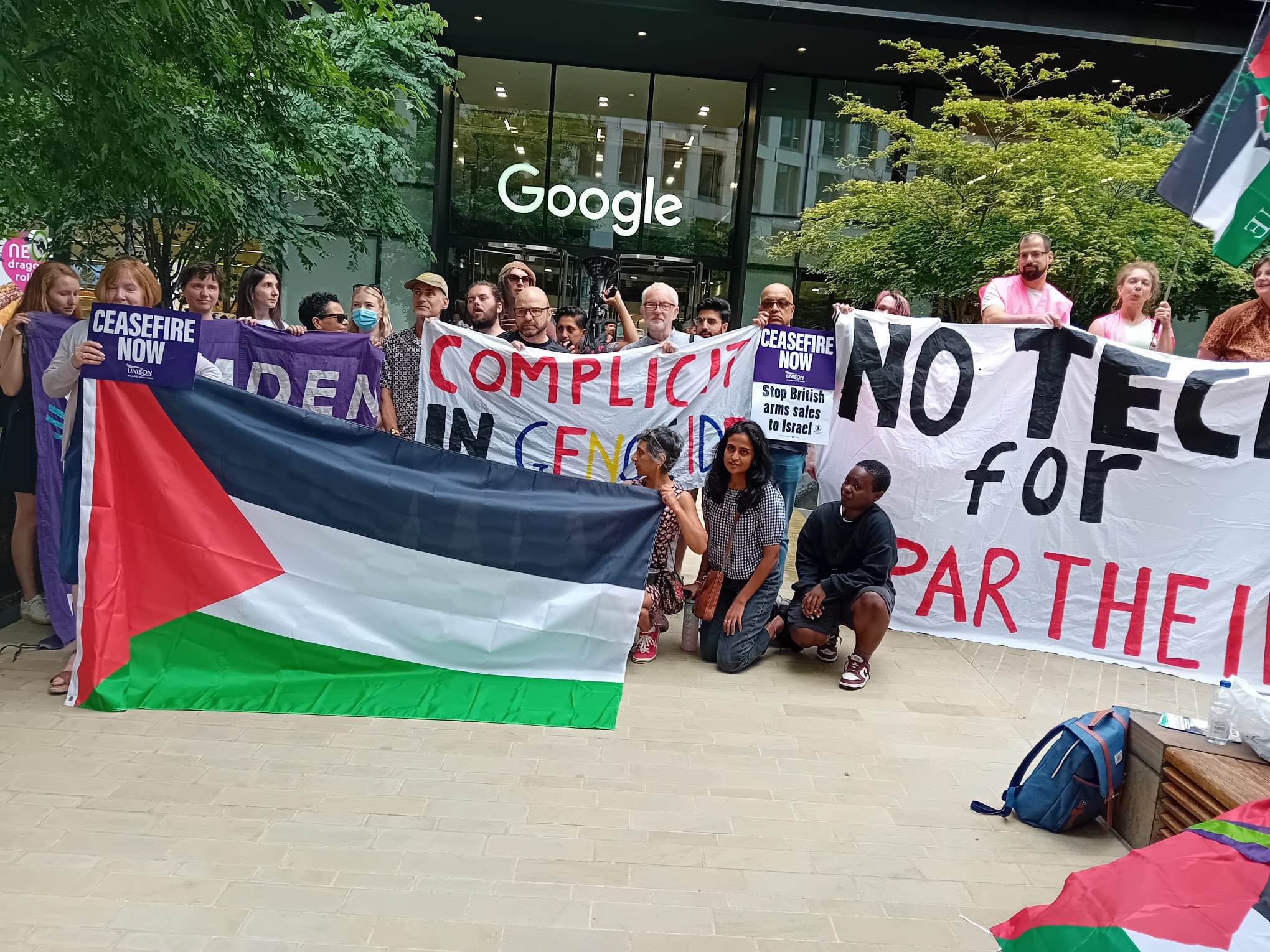 تجمهر متظاهرون أمام المقر الرئيسي لشركة "غوغل" في لندن بمن فيهم جيريمي كوربن، تضامنا مع الموظفين الذي يطالبون شركتهم بإنهاء مشروع "نيمباس - Nimbus" الذي يعمل على تمكين الفصل العنصري الإسرائيلي والإبادة الجماعية ضد الفلسطينيين، بحسب ما نقلته "حملة التضامن مع فلسطين" عبر موقع "ْX".