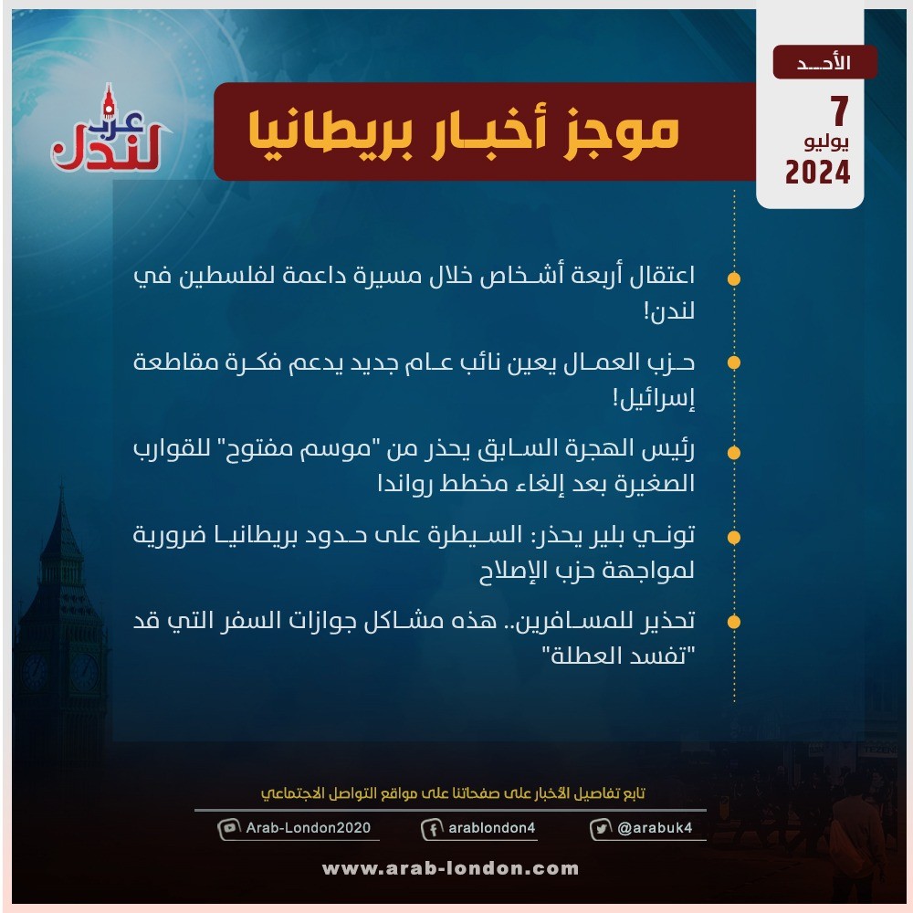 الرئيسية أخبار موجز أخبار بريطانيا من منصة عرب لندن: الأحد 7 يوليو / تموز 2024 أخبار موجز أخبار بريطانيا من منصة عرب لندن: الأحد 7 يوليو / تموز 2024 2024-07-07 اعتقال أربعة أشخاص خلال مسيرة داعمة لفلسطين في لندن!حزب العمال يعين نائب عام جديد يدعم فكرة مقاطعة إسرائيل!رئيس الهجرة السابق يحذر من "موسم مفتوح" للقوارب الصغيرة بعد إلغاء مخطط روانداتوني بلير يحذر: السيطرة على حدود بريطانيا ضرورية لمواجهة حزب الإصلاحتحذير للمسافرين.. هذه مشاكل جوازات السفر التي قد “تفسد العطلة” السابق مسيرة لندن الكبرى..تتغير الحكومات ويبقى مناصرو فلسطين ثابتون على موقفهم التالي سويلا برافرمان: "المحافظون فشلوا في السلطة واستحقوا هزيمة تاريخية في الانتخابات"! تابعوا آخر أخبار عرب لندن عبر Google News الاكثر قراءة الديلي ميل: دبي انتهت والناس يفرون منها !! 2026-03-12 الحرب الإيرانية تعطل خطط السفر في الأعياد و"بريتيش إيرويز" تلغي رحلاتها للشرق الأوسط 2026-03-11 لندن تدرس فرض رسوم إضافية على سيارات الدفع الرباعي للحد من حوادث الطرق 2026-03-13 أمسية حوارية على منصة عرب لندن بعنوان “زلزال قوانين الهجرة البريطانية” 2026-03-14 هل تحولت السياسة الأمريكية إلى حرب صليبية على إيران بقيادة وزير الدفاع الأمريكي؟ 2026-03-12 مهندس بريطاني يحوّل طائرة "بوينغ 737" إلى ملجأ نووي في حديقة منزله 2026-03-12 مقالات ذات صلة شرطة لندن تضغط على واشنطن لكشف ملفات إبستين الكاملة في قضية ماندلسون 2026-03-17 هل تخطط لاختبار القيادة؟ DVSA تطلق قواعد جديدة للحجز ابتداءً من مايو 2026-03-17 "عار وطني": تراكم أعمال إصلاح الحفر يصل إلى 18.6 مليار جنيه إسترليني في إنجلترا وويلز 2026-03-17 شرطة ساسكس تطلق تحذيرًا للجمهور بعد هروب سجين خطير من سجن فورد 2026-03-17 مجلس كينت يعلن عبور القوارب الصغيرة تهديدًا إرهابيًا ويصوّت على "حالة طوارئ الهجرة" 2026-03-17