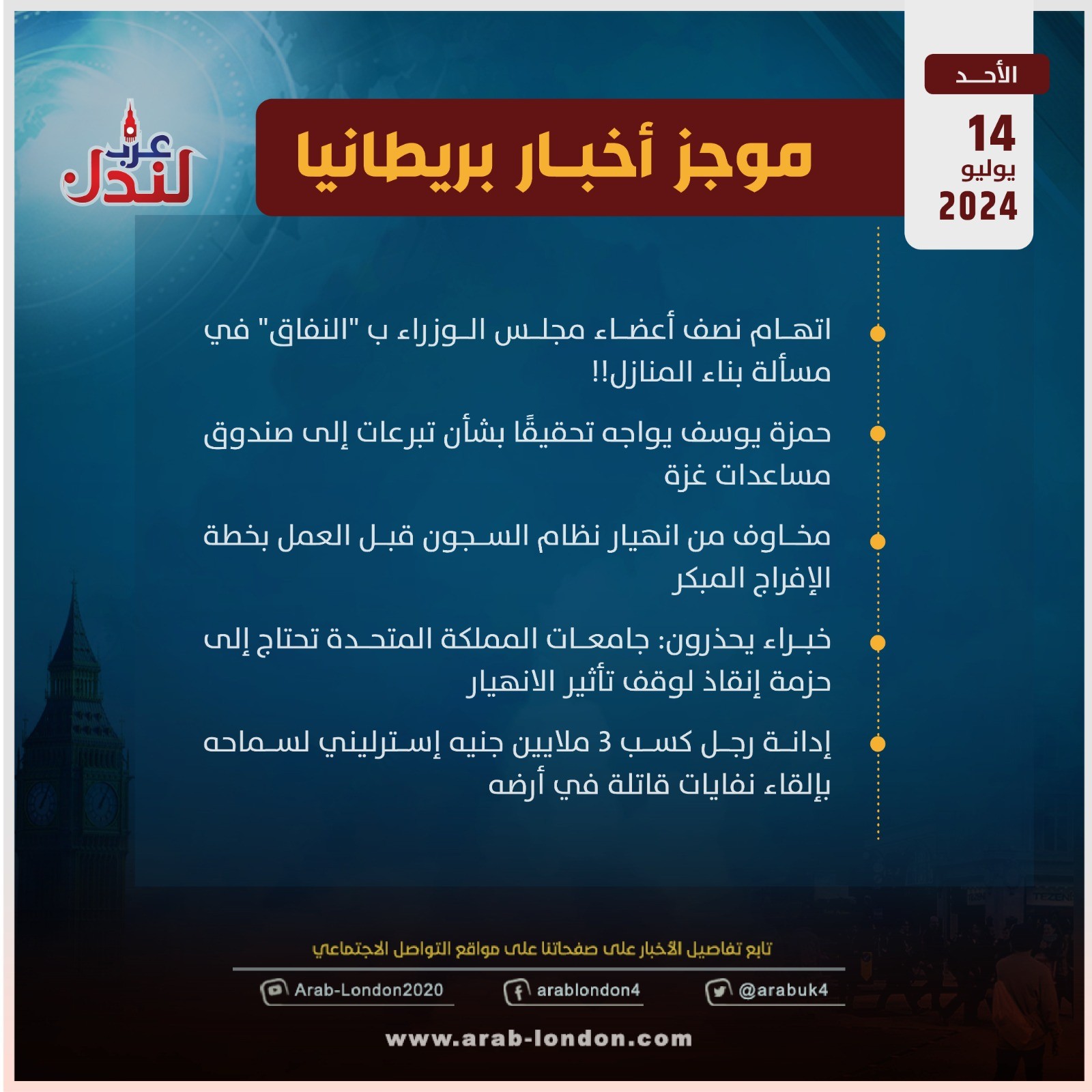 موجز أخبار بريطانيا من منصة عرب لندن: الأحد 14 يوليو / تموز 2024