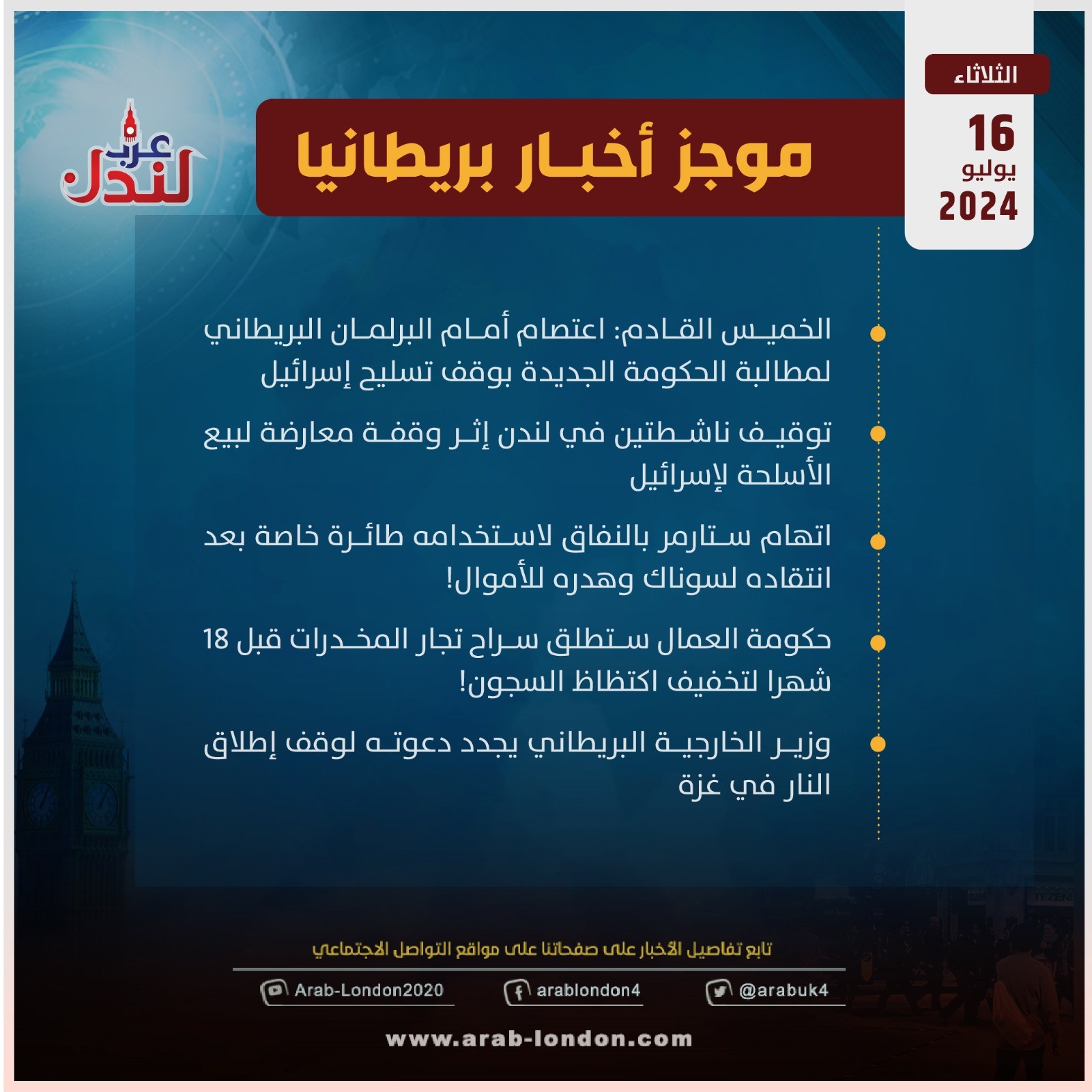 الرئيسية أخبار موجز أخبار بريطانيا من منصة عرب لندن: الثلاثاء 16 يوليو / تموز 2024 أخبار موجز أخبار بريطانيا من منصة عرب لندن: الثلاثاء 16 يوليو / تموز 2024 2024-07-16 الخميس القادم: اعتصام أمام البرلمان البريطاني لمطالبة الحكومة الجديدة بوقف تسليح إسرائيلتوقيف ناشطتين في لندن إثر وقفة معارضة لبيع الأسلحة لإسرائيلاتهام ستارمر بالنفاق لاستخدامه طائرة خاصة بعد انتقاده لسوناك وهدره للأموال!حكومة العمال ستطلق سراح تجار المخدرات قبل 18 شهرا لتخفيف اكتظاظ السجون!وزير الخارجية البريطاني يجدد دعوته لوقف إطلاق النار في غزة السابق حصري: نتائج استطلاع "عرب لندن" لاتجاهات تصويت العرب خلال الانتخابات البريطانية الأخيرة التالي حكومة العمال ستطلق سراح تجار المخدرات قبل 18 شهرا لتخفيف اكتظاظ السجون! تابعوا آخر أخبار عرب لندن عبر Google News الاكثر قراءة الديلي ميل: دبي انتهت والناس يفرون منها !! 2026-03-12 الحرب الإيرانية تعطل خطط السفر في الأعياد و"بريتيش إيرويز" تلغي رحلاتها للشرق الأوسط 2026-03-11 لندن تدرس فرض رسوم إضافية على سيارات الدفع الرباعي للحد من حوادث الطرق 2026-03-13 أمسية حوارية على منصة عرب لندن بعنوان “زلزال قوانين الهجرة البريطانية” 2026-03-14 هل تحولت السياسة الأمريكية إلى حرب صليبية على إيران بقيادة وزير الدفاع الأمريكي؟ 2026-03-12 مهندس بريطاني يحوّل طائرة "بوينغ 737" إلى ملجأ نووي في حديقة منزله 2026-03-12 مقالات ذات صلة هل تخطط لاختبار القيادة؟ DVSA تطلق قواعد جديدة للحجز ابتداءً من مايو 2026-03-17 "عار وطني": تراكم أعمال إصلاح الحفر يصل إلى 18.6 مليار جنيه إسترليني في إنجلترا وويلز 2026-03-17 شرطة ساسكس تطلق تحذيرًا للجمهور بعد هروب سجين خطير من سجن فورد 2026-03-17 مجلس كينت يعلن عبور القوارب الصغيرة تهديدًا إرهابيًا ويصوّت على "حالة طوارئ الهجرة" 2026-03-17 وفاة مأساوية لعامل حدائق تشعل معركة قانونية ضد شركة كهرباء 2026-03-17