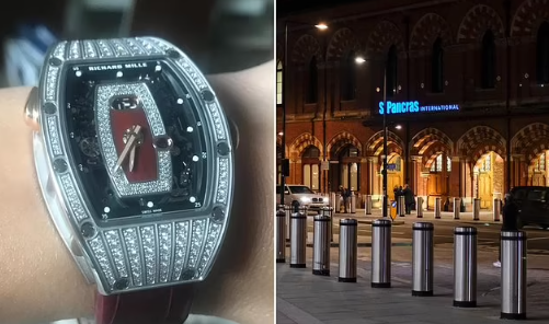 سُرقت ساعة امرأة المصممة بقيمة 185 ألف جنيه إسترليني أمام أطفالها في عملية سطو "مرعبة" خارج محطة سانت بانكراس. حيث كانت الضحية خارج المحطة مع أطفالها الثلاثة حوالي الساعة 10.45 مساءً يوم الأحد (21 يوليو) عندما اقترب منها ثلاثة رجال من الخلف.