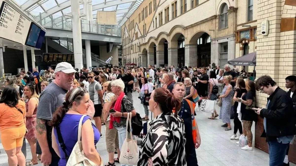 تظهر الصور المرسلة إلى صحيفة "مانشستر إيفننغ" عشرات المسافرين وهم ينتظرون في ردهة محطة القطار بعد تعطل الرحلات.