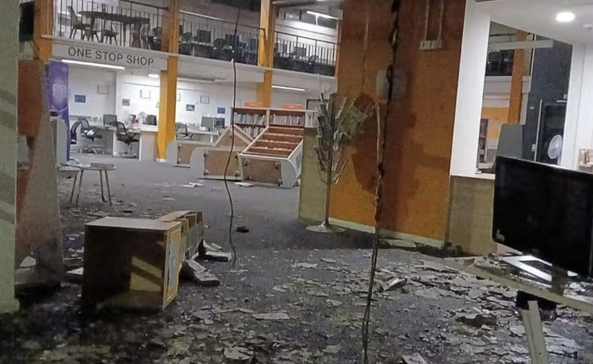 وتعرض الطابق الأرضي لمكتبة سبيلو لين لأضرار جسيمة جراء الحريق، بعد أن كانت قد جُدِّدَت مؤخرًا إثر تعرضها سابقًا للنهب والحرق. وأفادت الشرطة أن المشاغبين حاولوا منع رجال الإطفاء من الوصول إلى الموقع لإخماد الحريق، حيث ألقوا مقذوفات على سيارة الإطفاء وكسروا نافذتها الخلفية.