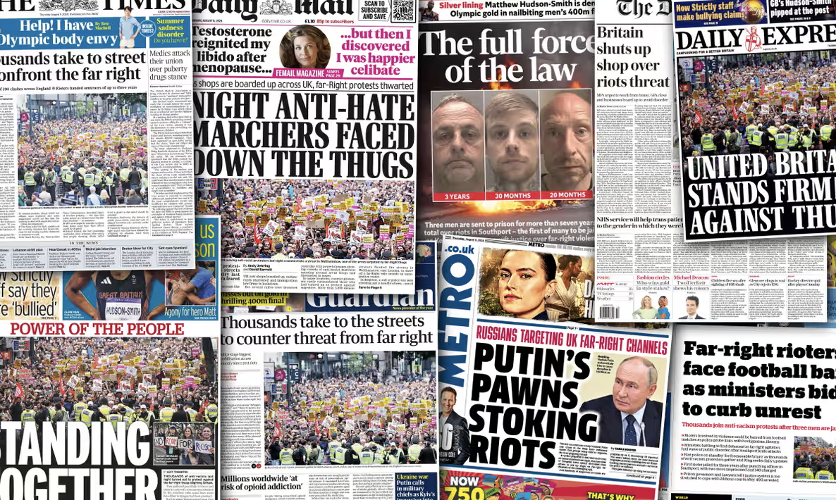 وجاء عنوان صحيفة "إكسبريس" ”Express“ "بريطانيا المتحدة تقف صامدة في وجه البلطجية"، مرفقًا بصورة للمتظاهرين المضادين في وولثامستو. ويعكس العنوان والصورة وحدة المجتمع في التصدي لتهديدات اليمين المتطرف.