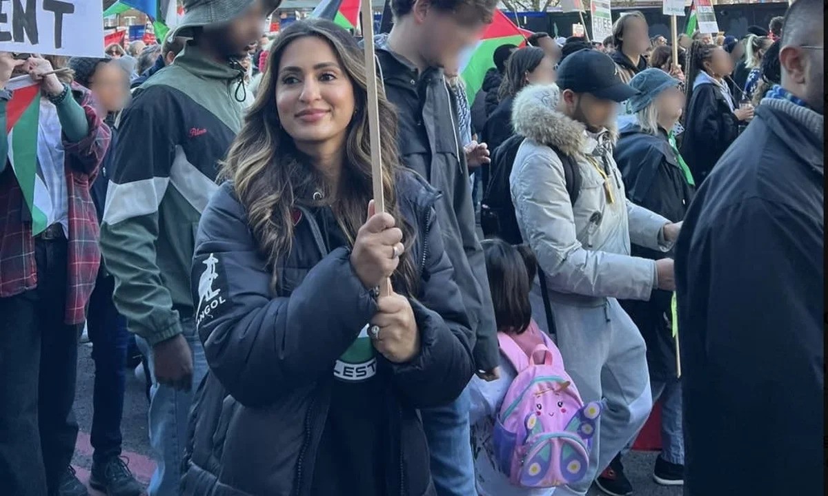 دعت المعلمة التي حملت لافتة في مظاهرة مؤيدة لفلسطين تصور ريشي سوناك وسويلا برافرمان على هيئة جوز هند لإجراء تحقيق من قبل هيئة مراقبة الشرطة في تعامل شرطة العاصمة مع القضية.