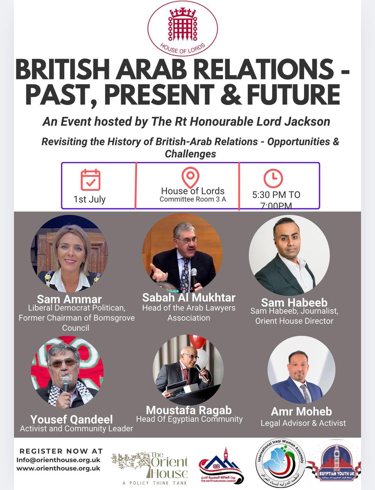 يستضيف مجلس اللوردات البريطاني في الأول من يوليو فعالية بارزة بعنوان "العلاقات البريطانية العربية – الماضي، الحاضر والمستقبل"، وذلك تحت رعاية اللورد جاكسون، في قاعة اللجنة 3A داخل البرلمان البريطاني.