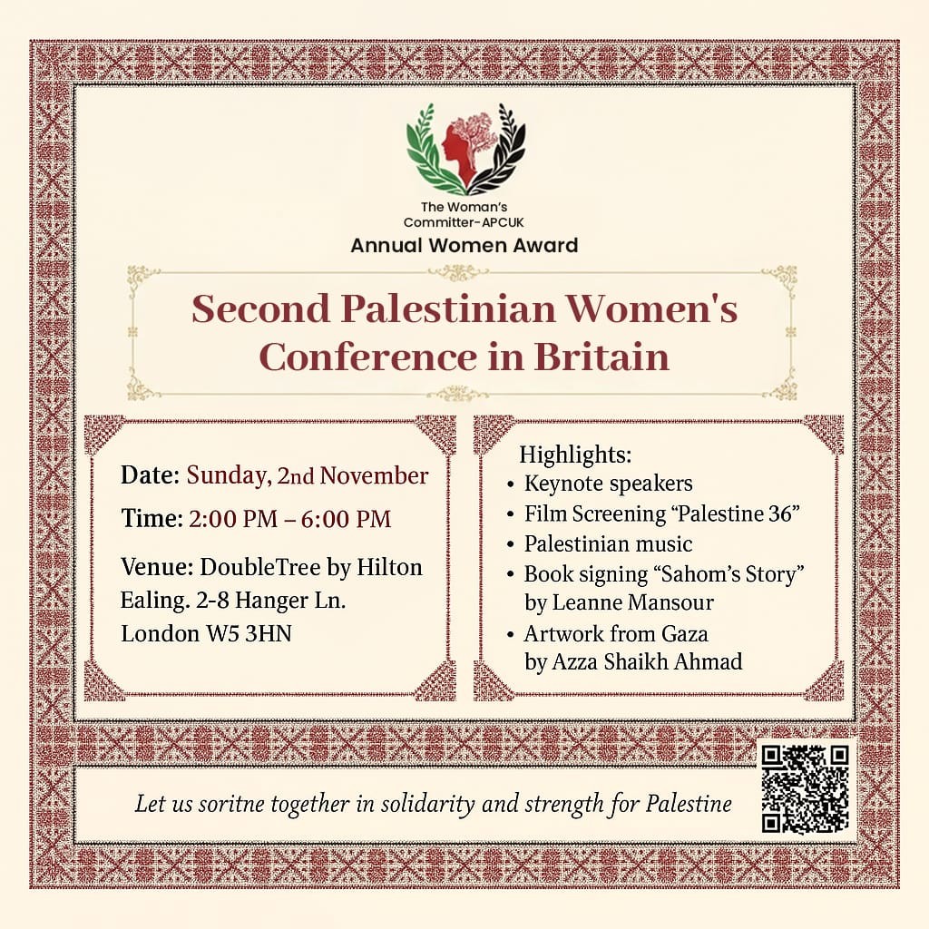 تستضيف العاصمة البريطانية لندن يوم الأحد 2 نوفمبر 2025 فعاليات المؤتمر الثاني للمرأة الفلسطينية في بريطانيا، الذي تنظمه لجنة المرأة في رابطة الجالية الفلسطينية في بريطانيا (APCUK)، في فندق DoubleTree by Hilton London - Ealing, 2-8 Hanger Ln, London W5 3HN ، من الساعة الثانية بعد الظهر حتى السادسة مساءً.