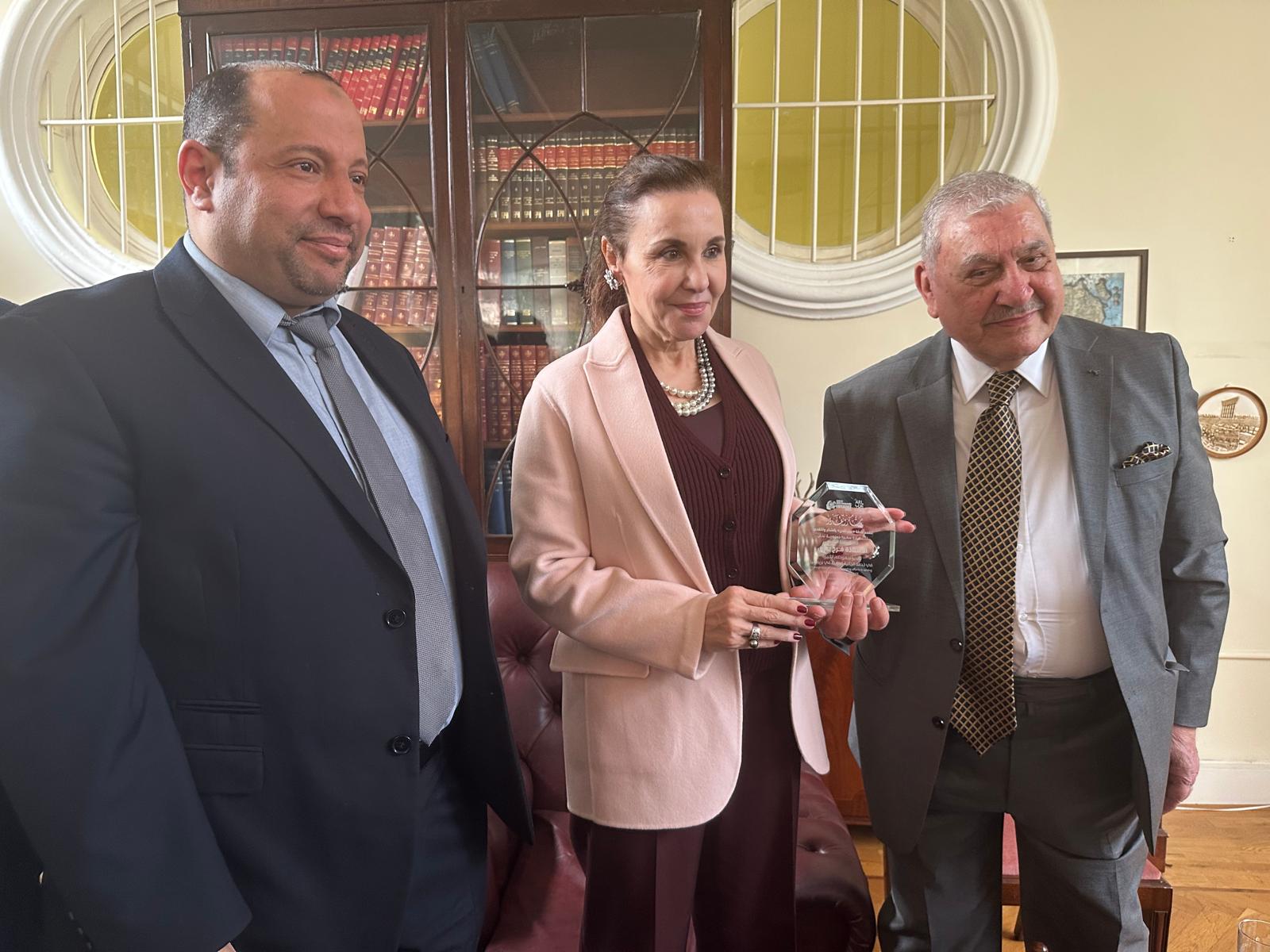 وقدَّم الوفد درعاً تكريمياً للسفيرة اللبنانية خلال زيارة خاصة قام بها للسفارة في لندن، حيث استمعت السفيرة لشرح مفصل عن الأنشطة والجهود التي يقوم بها المؤتمر وأعضاؤه والمؤسسات التي تنضوي تحت مظلته، كما استمعت الى تقييم عام للأوضاع المتعلقة بأبناء الجالية العربية في بريطانيا بما فيهم اللبنانيون.