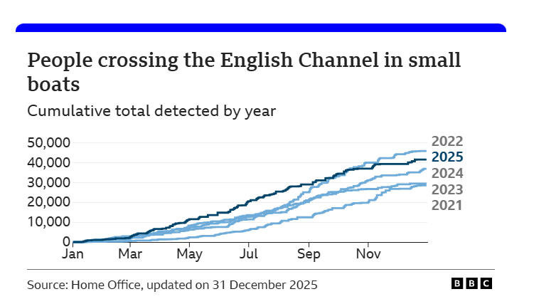 وسجل عدد المهاجرين الذين وصلوا إلى المملكة المتحدة من فرنسا ارتفاعًا من 36,566 في 2024 إلى 41,472 في 2025، رغم انخفاضه عن ذروة 2022 التي بلغت 45,774 مهاجرًا.