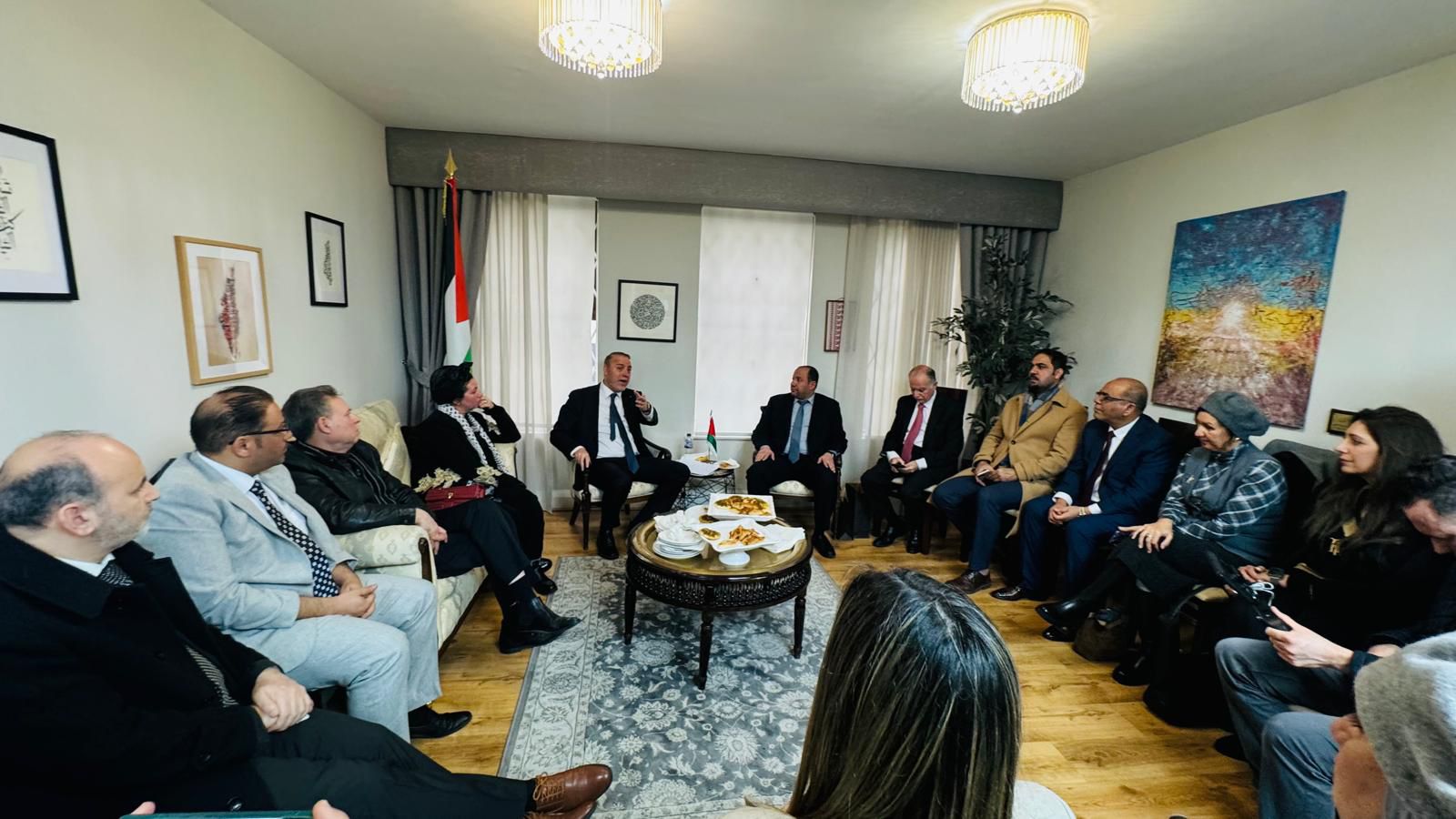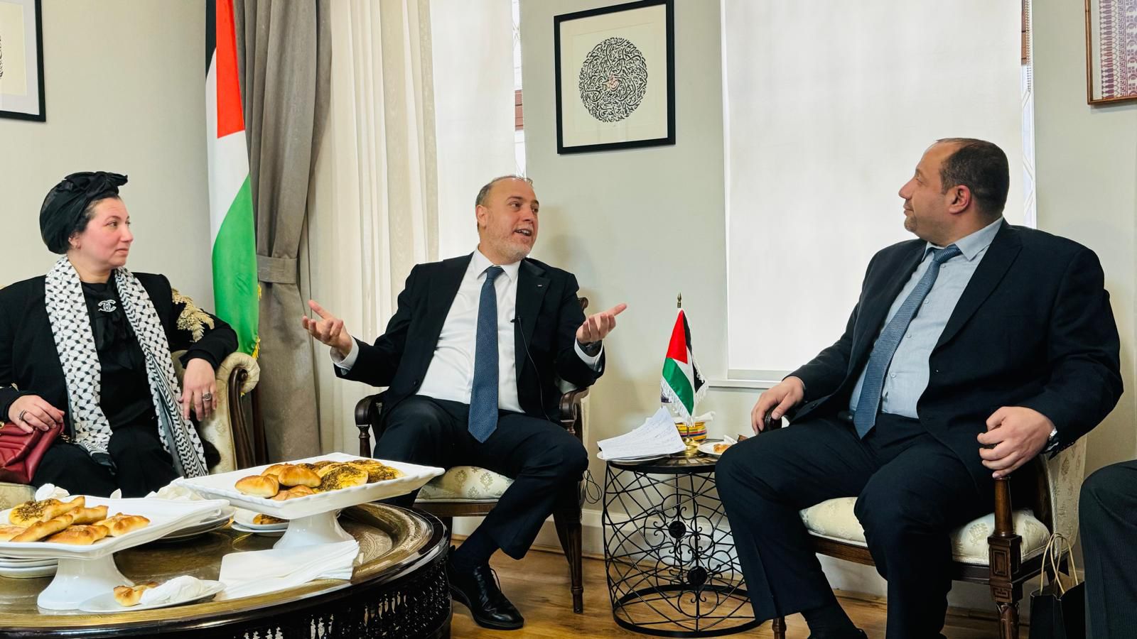 حمل وفد مؤتمر الجالية العربية في بريطانيا رسائل تضامن ودعم للسفارة الفلسطينية في أول زيارة لمقرها عقب التدشين الرسمي لها في المملكة المتحدة.