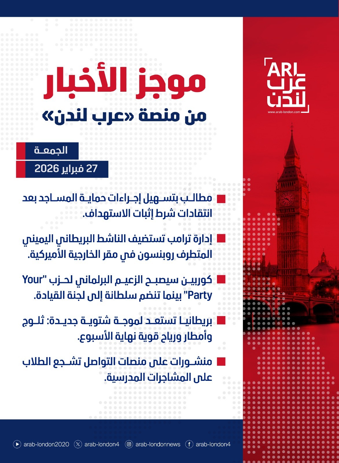الرئيسية أخبار موجز أخبار بريطانيا من منصة عرب لندن: الجمعة : 27 فبراير / شباط 2026 أخبار موجز أخبار بريطانيا من منصة عرب لندن: الجمعة : 27 فبراير / شباط 2026 2026-02-27 🔴مطالب بتسهيل إجراءات حماية المساجد بعد انتقادات شرط إثبات الاستهداف 🔴إدارة ترامب تستضيف الناشط البريطاني اليميني المتطرف روبنسون في مقر الخارجية الأميركي 🔴كوربين سيصبح الزعيم البرلماني لحزب "Your Party" بينما تنضم سلطانة إلى لجنة القيادة 🔴بريطانيا تستعد لموجة شتوية جديدة: ثلوج وأمطار ورياح قوية نهاية الأسبوع 🔴منشورات على منصات التواصل تشجع الطلاب على المشاجرات المدرسية السابق الخضر ينتزعون مقعداً جديداً في مانشستر ويوجهون ضربة سياسية للعمال والإصلاح التالي بريطانيا: سيدة ورضيعها كادوا يموتون بعد تأجيل ولادتها القيصرية في عطلة نهاية الأسبوع تابعوا آخر أخبار عرب لندن عبر Google News الاكثر قراءة انتبهوا لأولادكم! منشورات على منصات التواصل تشجع الطلاب على المشاجرات المدرسية 2026-02-27 الخضر ينتزعون مقعداً جديداً في مانشستر ويوجهون ضربة سياسية للعمال والإصلاح 2026-02-27 بريطانيا تقرّ إجراءات مشددة: السماح لآلاف اللاجئين بالعمل مقابل رفع الدعم الحكومي 2026-03-05 بريطانيا تعلق "بشكل مفاجئ" تأشيرات الدراسة لأربع دول لمنع استغلال نظام اللجوء 2026-03-04 ستارمر: مقاتلات بريطانية تنفذ مهام دفاعية لحماية الحلفاء بعد ضرب إيران 2026-02-28 شبانة محمود: اعتبارًا من اليوم سيحصل اللاجئون على حماية مؤقتة ومراجعة دورية لملفاتهم 2026-03-02 مقالات ذات صلة بريطانيا تسجل أعلى حرارة هذا العام وغبار الصحراء الكبرى يلوّن السماء 2026-03-05 برنامج تجريبي: 40 ألف جنيه إسترليني لتشجيع عائلات طالبي اللجوء المرفوضة على مغادرة بريطانيا 2026-03-05 في ظل توترات إقليمية متصاعدة… تكلفة الإجلاء من دبي تبلغ 250 ألف دولار 2026-03-05 بوتين يهدد بوقف إمدادات الغاز الروسي لأوروبا والتوجه إلى أسواق أخرى 2026-03-05 هيئة تنظيم المياه تغرّم “ساوث إيست ووتر” 22.5 مليون جنيه بعد انقطاعات مياه أثرت على مئات الآلاف 2026-03-05