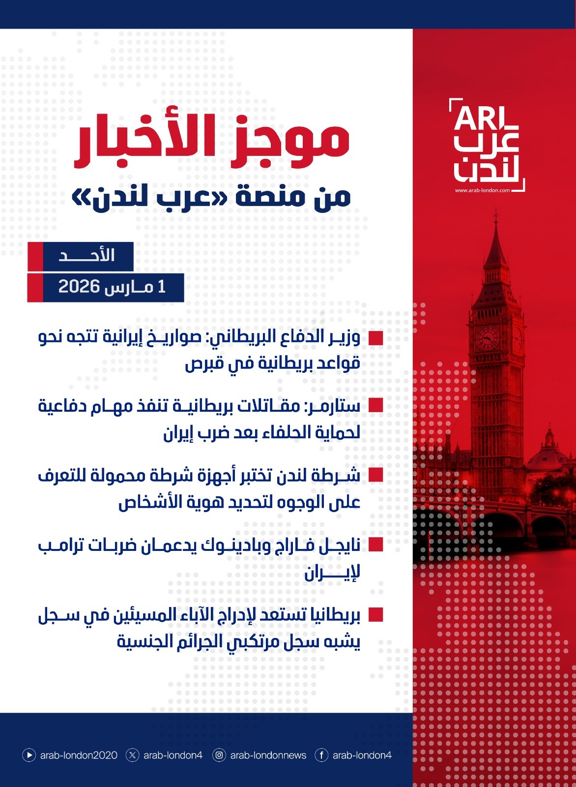 الرئيسية أخبار موجز أخبار بريطانيا من منصة عرب لندن: الأحد : 1 مارس/آذار 2026 أخبار موجز أخبار بريطانيا من منصة عرب لندن: الأحد : 1 مارس/آذار 2026 2026-03-01 🔴 وزير الدفاع البريطاني: صواريخ إيرانية تتجه نحو قواعد بريطانية في قبرص 🔴ستارمر: مقاتلات بريطانية تنفذ مهام دفاعية لحماية الحلفاء بعد ضرب إيران 🔴شرطة لندن تختبر أجهزة شرطة محمولة للتعرف على الوجوه لتحديد هوية الأشخاص 🔴نايجل فاراج وبادينوك يدعمان ضربات ترامب لإيران 🔴 بريطانيا تستعد لإدراج الآباء المسيئين في سجل يشبه سجل مرتكبي الجرائم الجنسية السابق نجاة طيار بعد تحطم طائرته الخفيفة قبالة شاطئ في Gosport التالي نايجل فاراج وبادينوك يدعمان ضربات ترامب لإيران تابعوا آخر أخبار عرب لندن عبر Google News الاكثر قراءة انتبهوا لأولادكم! منشورات على منصات التواصل تشجع الطلاب على المشاجرات المدرسية 2026-02-27 الخضر ينتزعون مقعداً جديداً في مانشستر ويوجهون ضربة سياسية للعمال والإصلاح 2026-02-27 بريطانيا تقرّ إجراءات مشددة: السماح لآلاف اللاجئين بالعمل مقابل رفع الدعم الحكومي 2026-03-05 بريطانيا تعلق "بشكل مفاجئ" تأشيرات الدراسة لأربع دول لمنع استغلال نظام اللجوء 2026-03-04 ستارمر: مقاتلات بريطانية تنفذ مهام دفاعية لحماية الحلفاء بعد ضرب إيران 2026-02-28 شبانة محمود: اعتبارًا من اليوم سيحصل اللاجئون على حماية مؤقتة ومراجعة دورية لملفاتهم 2026-03-02 مقالات ذات صلة بريطانيا تسجل أعلى حرارة هذا العام وغبار الصحراء الكبرى يلوّن السماء 2026-03-05 برنامج تجريبي: 40 ألف جنيه إسترليني لتشجيع عائلات طالبي اللجوء المرفوضة على مغادرة بريطانيا 2026-03-05 في ظل توترات إقليمية متصاعدة… تكلفة الإجلاء من دبي تبلغ 250 ألف دولار 2026-03-05 بوتين يهدد بوقف إمدادات الغاز الروسي لأوروبا والتوجه إلى أسواق أخرى 2026-03-05 هيئة تنظيم المياه تغرّم “ساوث إيست ووتر” 22.5 مليون جنيه بعد انقطاعات مياه أثرت على مئات الآلاف 2026-03-05