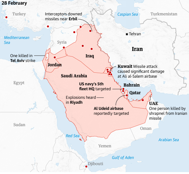ومنذ الهجوم الأمريكي الإسرائيلي على إيران، الذي أسفر عن مقتل المرشد الأعلى، علي خامنئي، وعدد من كبار المسؤولين، ردّت طهران بشن هجمات على إسرائيل والكويت والبحرين وقطر والسعودية والإمارات والأردن. واستهدفت الهجمات قواعد أمريكية ومطار الكويت وفندق Fairmont Hotel وناطحات سحاب في البحرين، جميعها مناطق كانت تُعتبر سابقًا آمنة نسبيًا.
