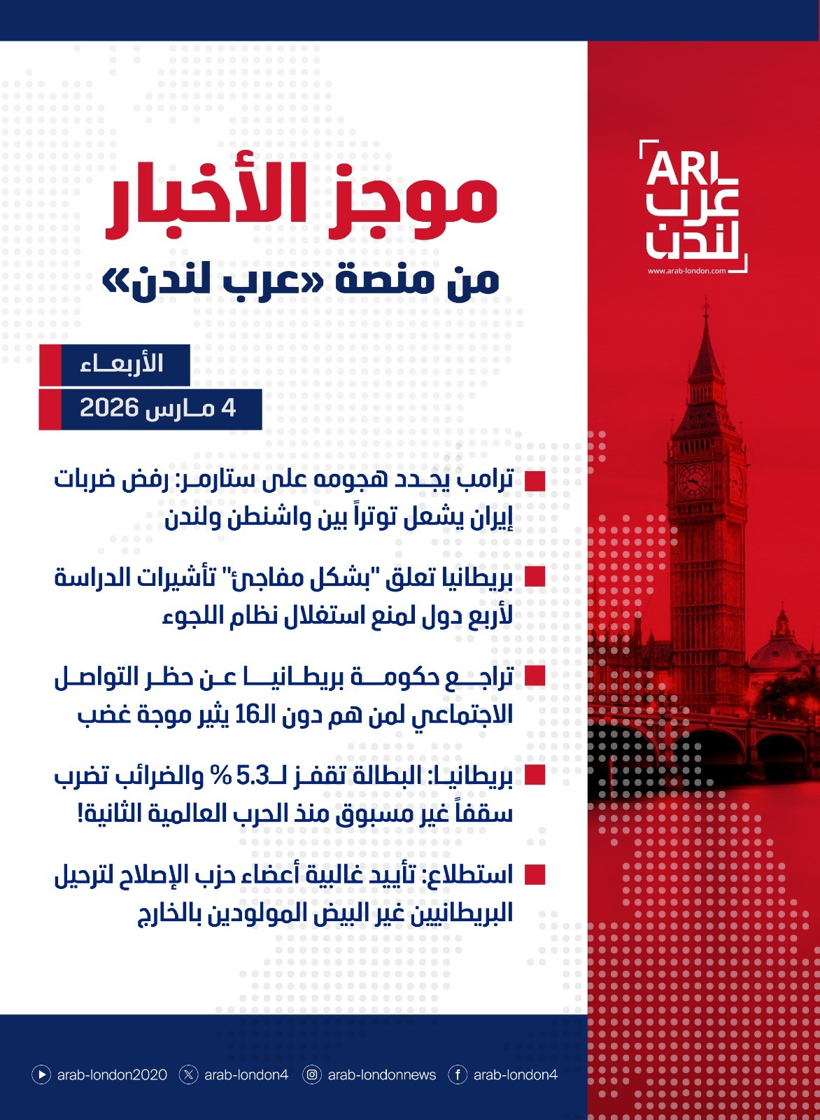 الرئيسية أخبار موجز أخبار بريطانيا من منصة عرب لندن: الأربعاء : 4 مارس/آذار 2026 أخبار موجز أخبار بريطانيا من منصة عرب لندن: الأربعاء : 4 مارس/آذار 2026 2026-03-04 🔴ترامب يجدد هجومه على ستارمر: رفض ضربات إيران يشعل توتراً بين واشنطن ولندن 🔴بريطانيا تعلق "بشكل مفاجئ" تأشيرات الدراسة لأربع دول لمنع استغلال نظام اللجوء 🔴تراجع حكومة بريطانيا عن حظر التواصل الاجتماعي لمن هم دون الـ16 يثير موجة غضب 🔴بريطانيا: البطالة تقفز لـ 5.3% والضرائب تضرب سقفاً غير مسبوق منذ الحرب العالمية الثانية! 🔴استطلاع: تأييد غالبية أعضاء حزب الإصلاح لترحيل البريطانيين غير البيض المولودين بالخارج السابق مكتب مسؤولية الميزانية يتوقع مغادرة 50 ألف بريطاني إضافي سنوياً حتى 2030 التالي تراجع حكومة بريطانيا عن حظر التواصل الاجتماعي لمن هم دون الـ16 يثير موجة غضب تابعوا آخر أخبار عرب لندن عبر Google News الاكثر قراءة انتبهوا لأولادكم! منشورات على منصات التواصل تشجع الطلاب على المشاجرات المدرسية 2026-02-27 الخضر ينتزعون مقعداً جديداً في مانشستر ويوجهون ضربة سياسية للعمال والإصلاح 2026-02-27 بريطانيا تقرّ إجراءات مشددة: السماح لآلاف اللاجئين بالعمل مقابل رفع الدعم الحكومي 2026-03-05 بريطانيا تعلق "بشكل مفاجئ" تأشيرات الدراسة لأربع دول لمنع استغلال نظام اللجوء 2026-03-04 ستارمر: مقاتلات بريطانية تنفذ مهام دفاعية لحماية الحلفاء بعد ضرب إيران 2026-02-28 شبانة محمود: اعتبارًا من اليوم سيحصل اللاجئون على حماية مؤقتة ومراجعة دورية لملفاتهم 2026-03-02 مقالات ذات صلة بريطانيا تسجل أعلى حرارة هذا العام وغبار الصحراء الكبرى يلوّن السماء 2026-03-05 برنامج تجريبي: 40 ألف جنيه إسترليني لتشجيع عائلات طالبي اللجوء المرفوضة على مغادرة بريطانيا 2026-03-05 في ظل توترات إقليمية متصاعدة… تكلفة الإجلاء من دبي تبلغ 250 ألف دولار 2026-03-05 بوتين يهدد بوقف إمدادات الغاز الروسي لأوروبا والتوجه إلى أسواق أخرى 2026-03-05 هيئة تنظيم المياه تغرّم “ساوث إيست ووتر” 22.5 مليون جنيه بعد انقطاعات مياه أثرت على مئات الآلاف 2026-03-05
