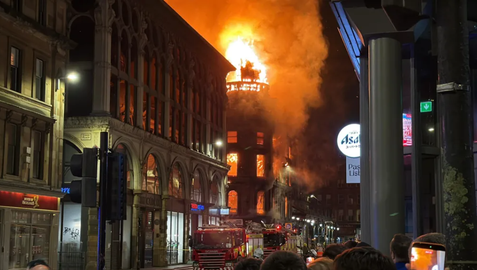 اندلع حريق هائل في مبنى محطة غلاسكو المركزية، مما أدى إلى انهياره جزئيًا دون تسجيل إصابات. وبدأ الحريق بعد ظهر الأحد في متجر للسجائر الإلكترونية في شارع يونيون، وامتد بسرعة ليشمل مبنى فورسيث التاريخي المصنف ضمن الفئة "ب"، ما تسبب بانهيار جزء من المبنى بعد ساعات من اندلاع النيران.
