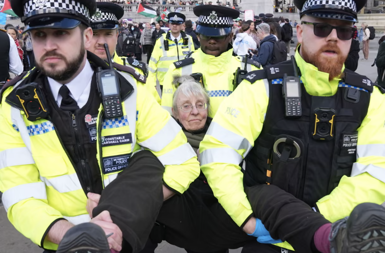 شهد ميدان "ترافلجار" في العاصمة البريطانية لندن يوم السبت مواجهة أمنية واسعة، انتهت باعتقال 523 شخصاً خلال مظاهرة حاشدة دعت إليها مجموعة "دافعوا عن هيئات المحلفين" (Defend Our Juries) تضامناً مع نشطاء "فلسطين أكشن".